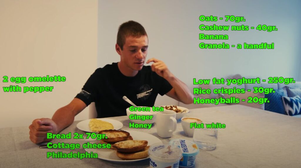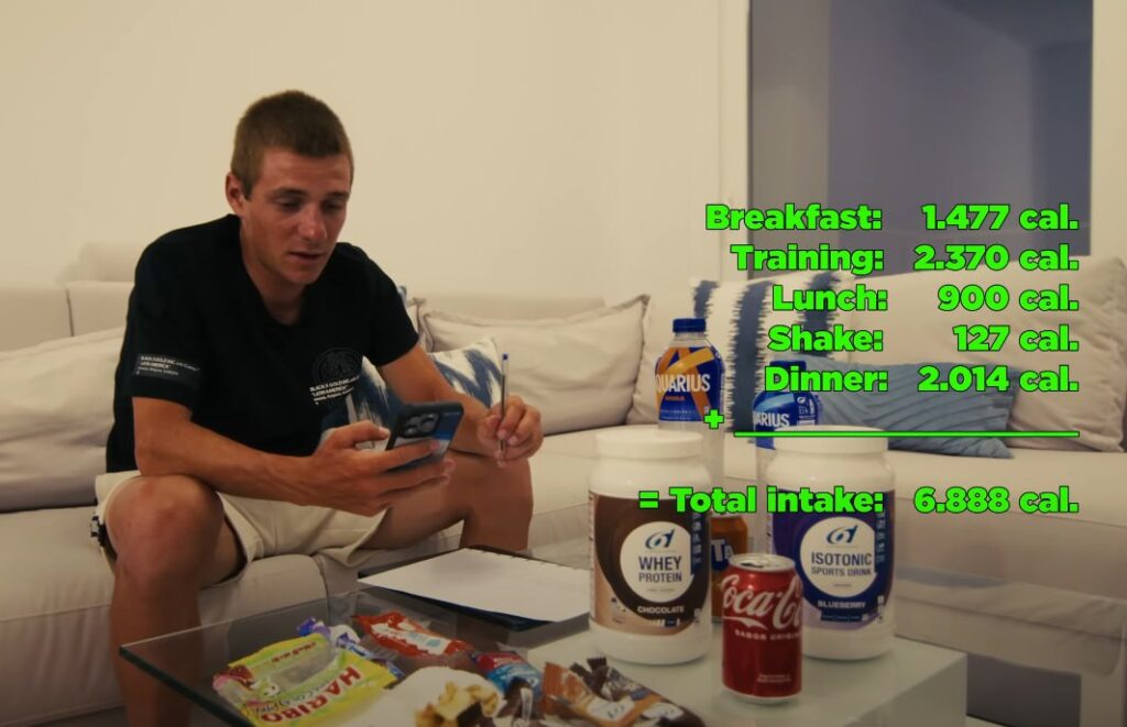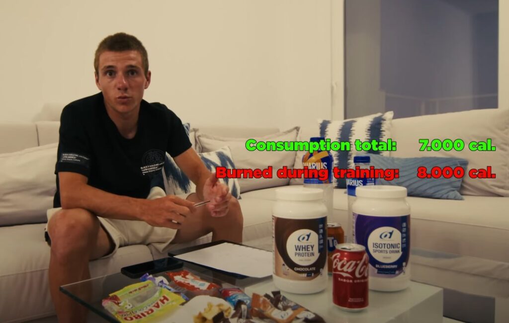 Велоспорт — один из самых сложных видов спорта, требующий значительной выносливости, поэтому-то и потребление калорий достаточно велико. Ремко Эвенпул во время подготовки к «Тур де Франс» в 2024 году только завтракал на 1400 килокалорий, во время тренировки добавлял ещё 2370 калорий, ланч — плюс 900, перекусы — 127, а обед — 2014, что в сумме давало 6888 килокалорий. Но и расходы энергии были велики — почти 8000 тысяч килокалорий.