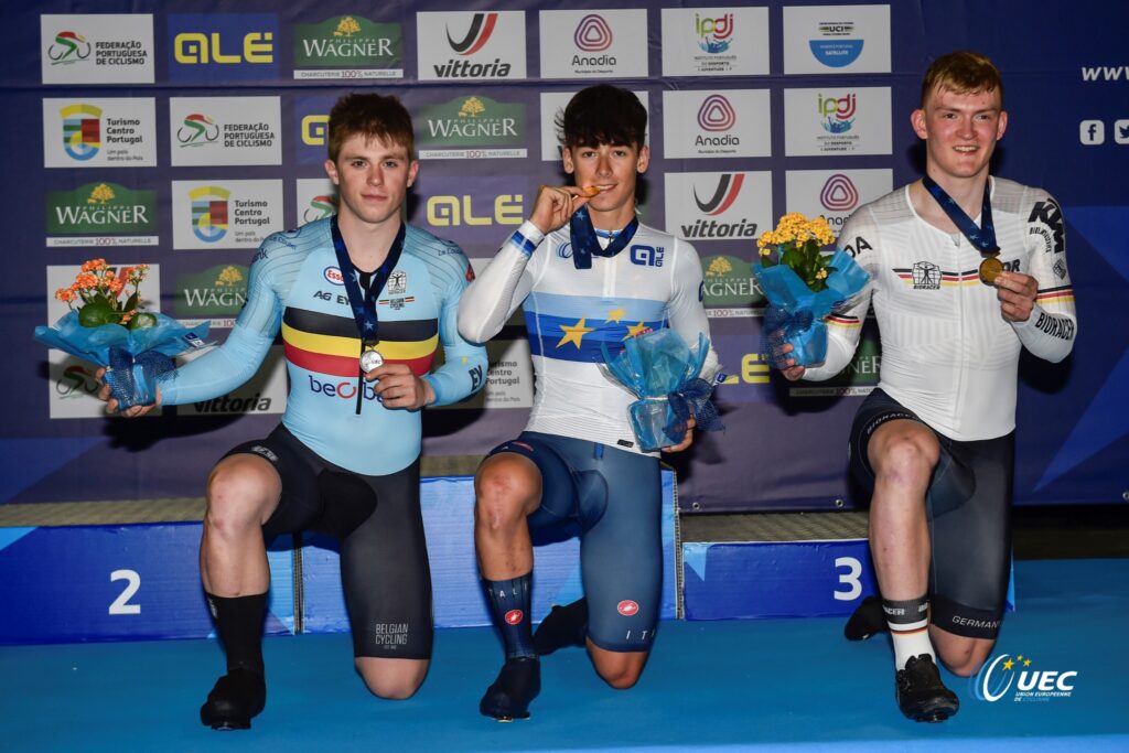 Нолана Хюисманс, Давиде Стелла и Джейкоб Фогт / 2023 UEC Juniores & U23 - Track European Championships - Anadia - 12/07/2023 - MenÕs Junior 1km TT - photo Tommaso Pelagalli / Sprint Cycling Agency © 2023