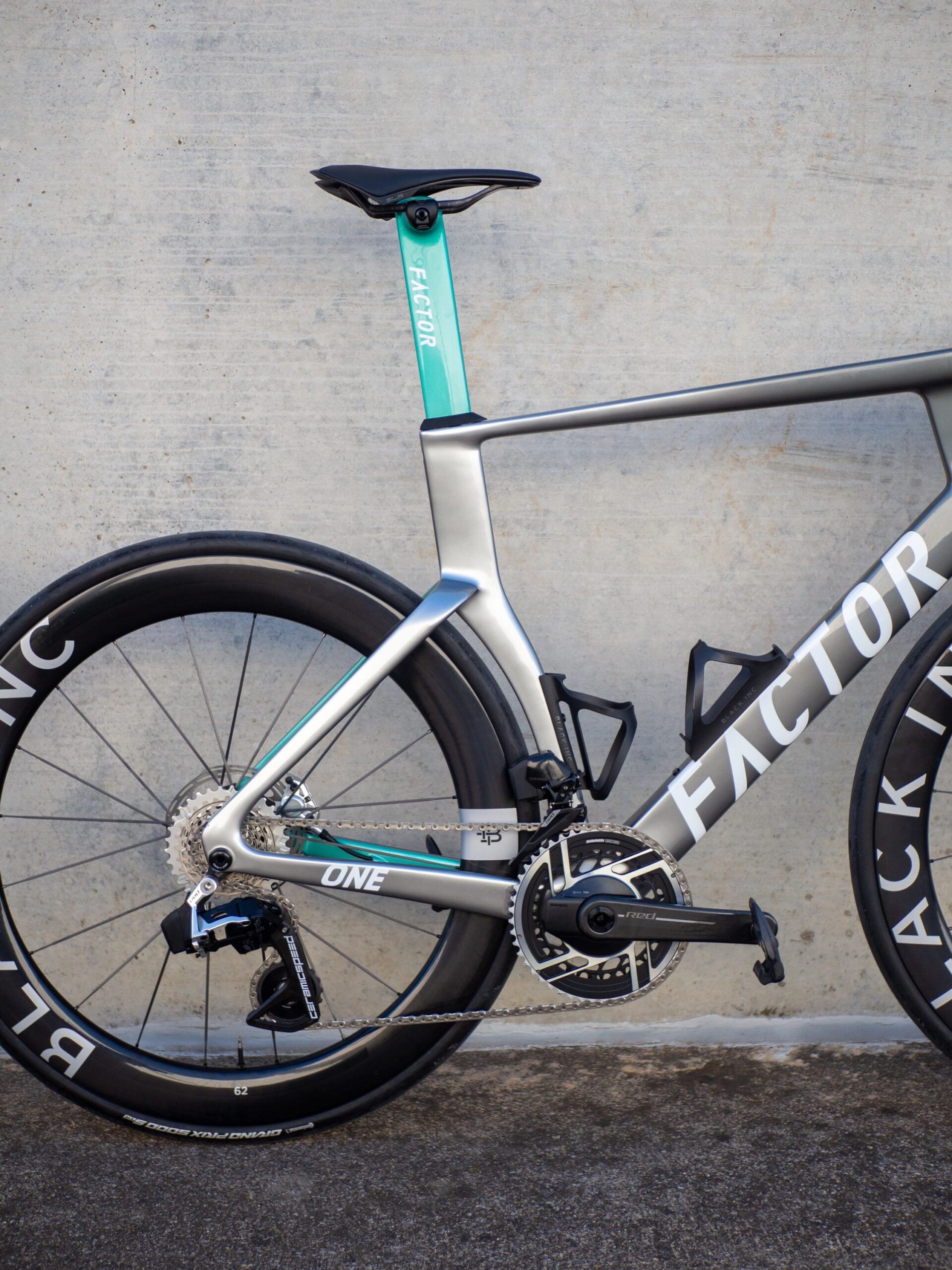 Вес рамы Factor не раскрыл, но предполагается, что собранный велосипед тянет примерно на 7,35 кг. В комплекте идут колёса Black Inc 62 — высокие, быстрые и идеально вписывающиеся в общую эстетику «скоростного лезвия».