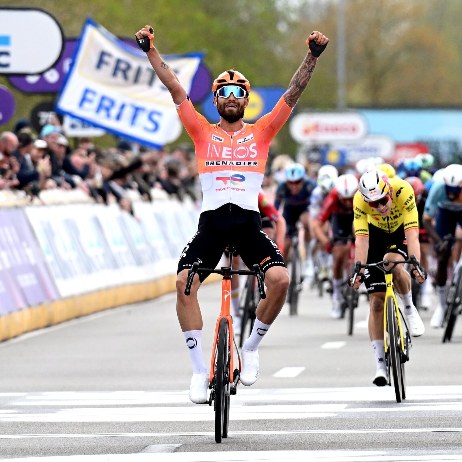 Итальянец Филиппо Ганна из INEOS Grenadiers одержал яркую победу на классике Дварс дор Фландерен (Dwars door Vlaanderen). Он догнал и обошёл Ваута ван Арта уже на финишной прямой в Варегеме, хотя бельгиец долгое время выглядел уверенным победителем после мощной сольной атаки. Звезде Visma | Lease a Bike не хватило всего 75 метров до финишной черты.