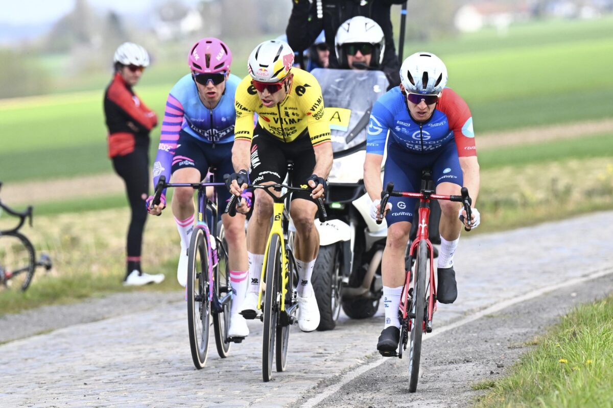 WAREGEM, BELGIUM — APRIL 01 : Van Aert Wout (BEL) of Team Visma | Lease a Bike, Gregoire Romain (FRA) of Groupama — FDJ United, Larsen Niklas (DEN) of Unibet Rose Rockets during the 80th edition of Dwars door Vlaanderen an UCI World Tour 1.UWT one day cycling road race for Men Elite of 184 km with start in Roeselare and finish in Waregem on April 1, 2026 in Waregem, Belgium, 01/04/2026 ( Motordriver Kenny Verfaillie — Photo by Tomas Sisk / Photonews/© Cor Vos 2026