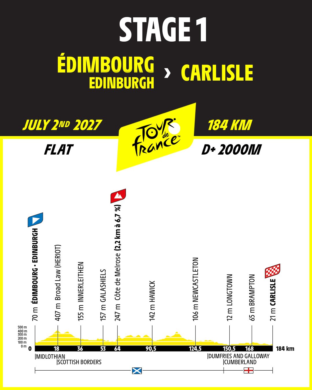 Этап №1 (2 июля): Эдинбург — Карлайл (184 км). Исторический старт у подножия Эдинбургского замка. Единственная категорийная вершина дня — Мельроз в Шотландии — не должна помешать спринтерам разыграть первую жёлтую майку в Карлайле.