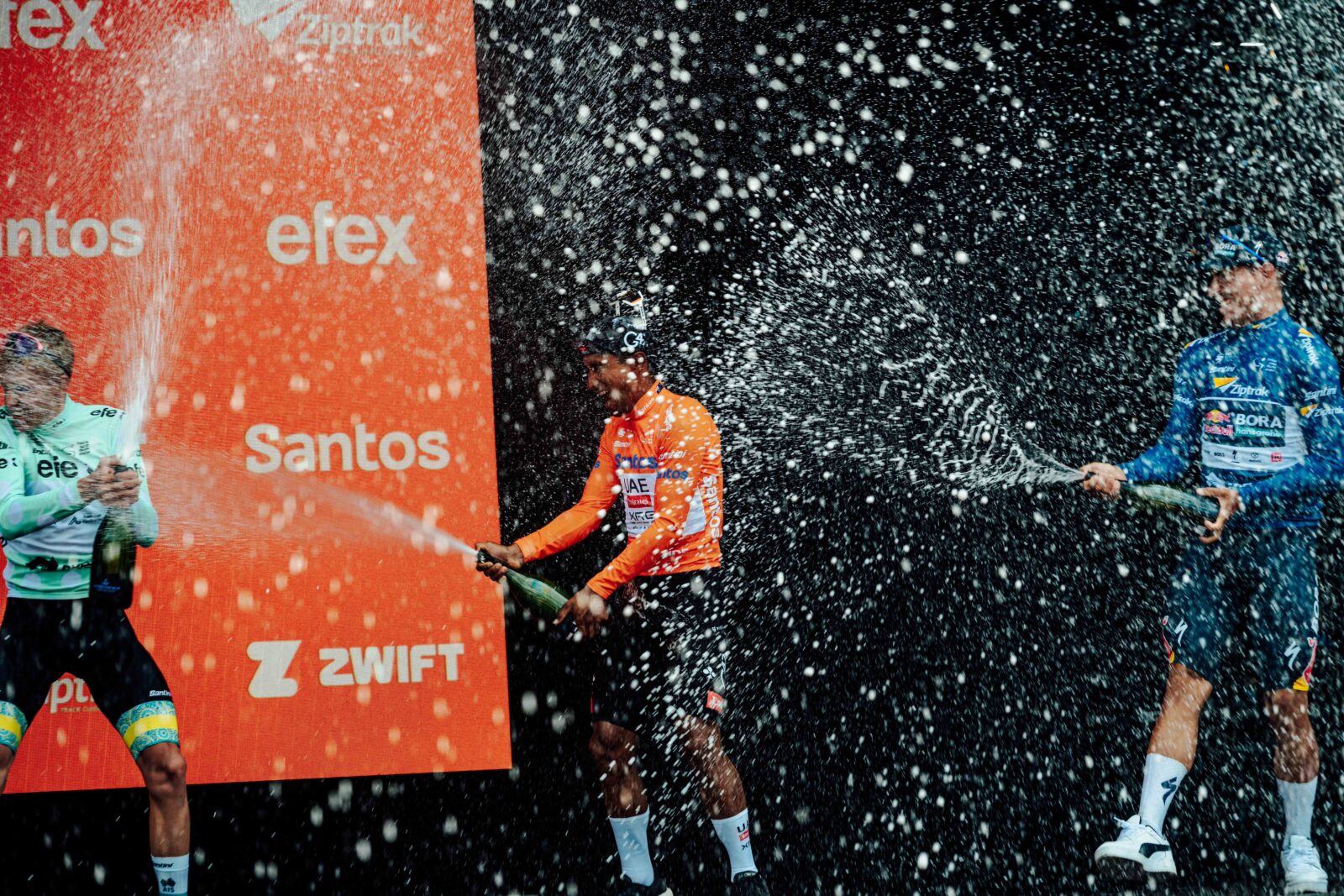 Сэм Уэлсфорд из Red Bull — Bora — Hansgrohe и Бриан Кокар из Cofidis сразились в спринте на заключительном этапе Tour Down Under: 90-километровый гладкий отрезок не стал проблемой для пелотона, и для Сэма — очередной удачный день, он выиграл три из шести этапов гонки.