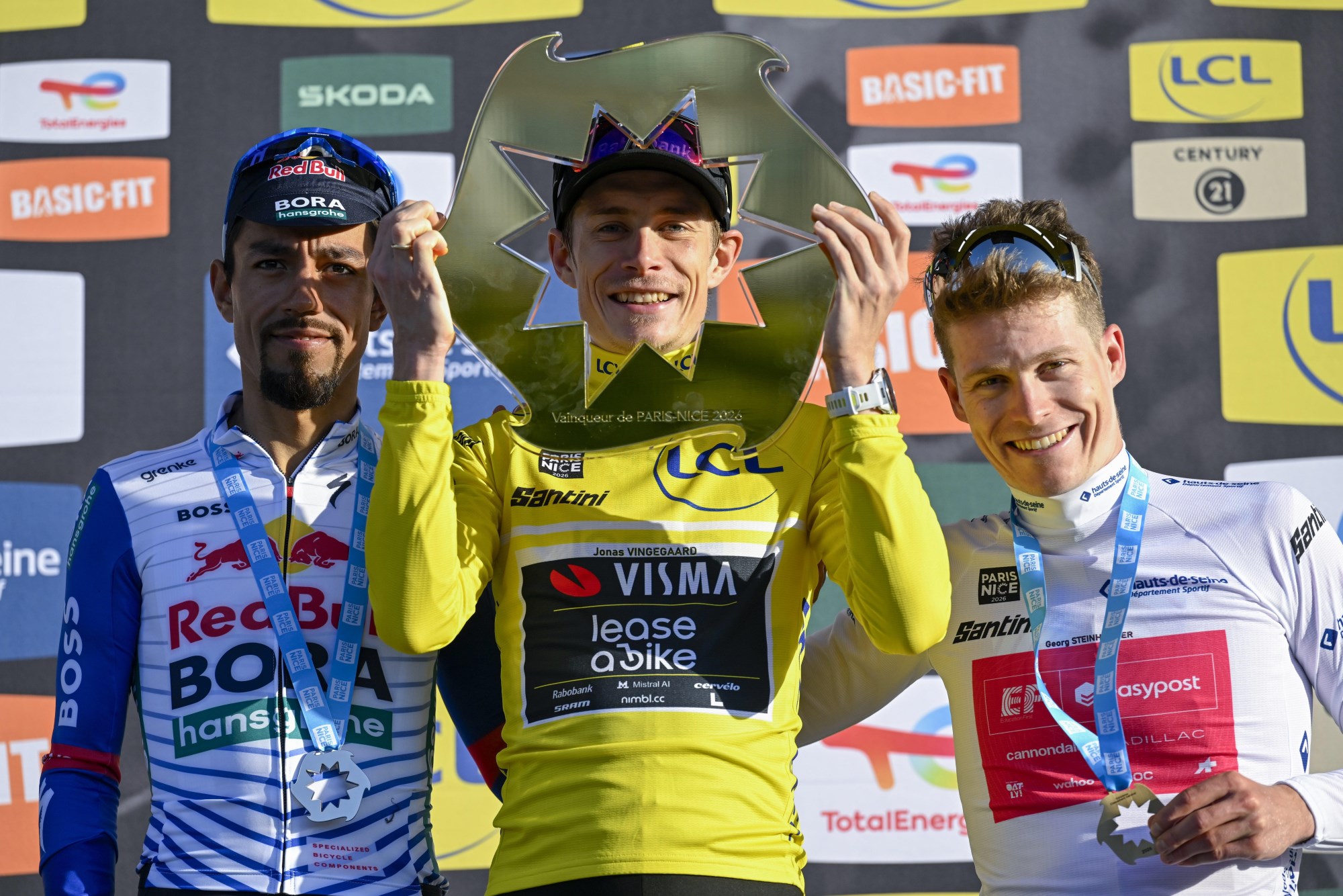 Даниэль Фелипе Мартинес, Йонас Вингегор и Георг Штайнхаузер на подиуме «Париж — Ницца — 2026»