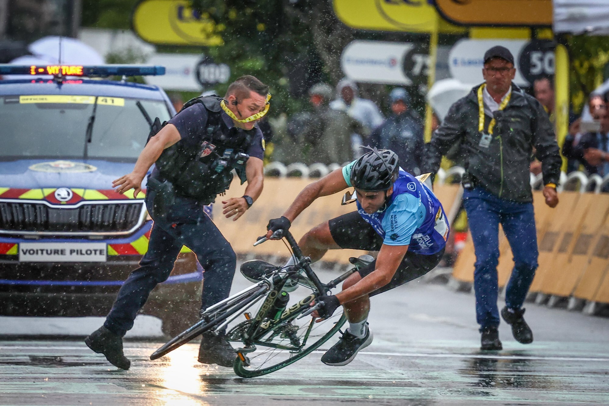 Буквально за несколько минут до победы Джонатана Милана прямо на финише ловили гонщика-любителя в майке Decathlon-AG2R La Mondiale, пытавшегося пересечь финишную черту. Мужчину повалили на землю, а затем оттащили с дороги. Это запечатлел фотограф агентства AFP. В трансляцию это не попало.