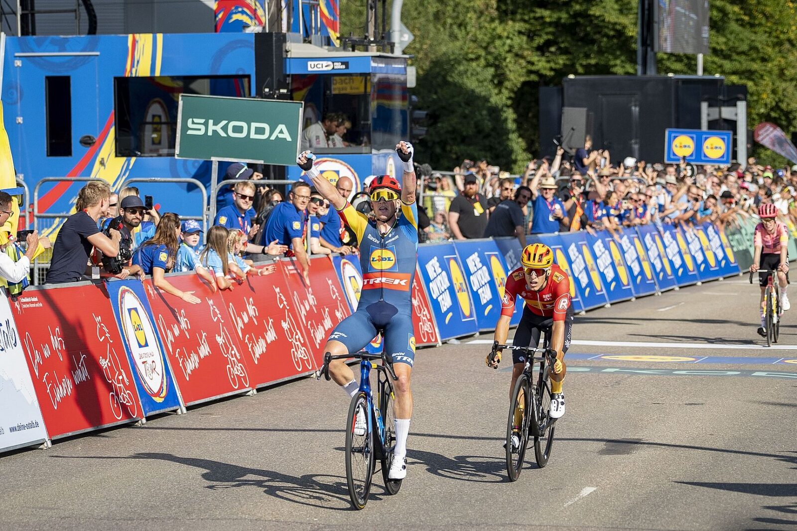 Мадс Педерсен был первым, кто пересёк финишную черту второго этапа велосипедного «Тура Германии» (Deutschland Tour): 174,6-километровая дистанция завершилась спринтом на троих, и это была лёгкая задача для датчанина из Lidl — Trek. Соперниками Мадса были Тобиас Холланд Йоханнессен из Uno-X Mobility и Арчи Райан из EF Education — EasyPost.