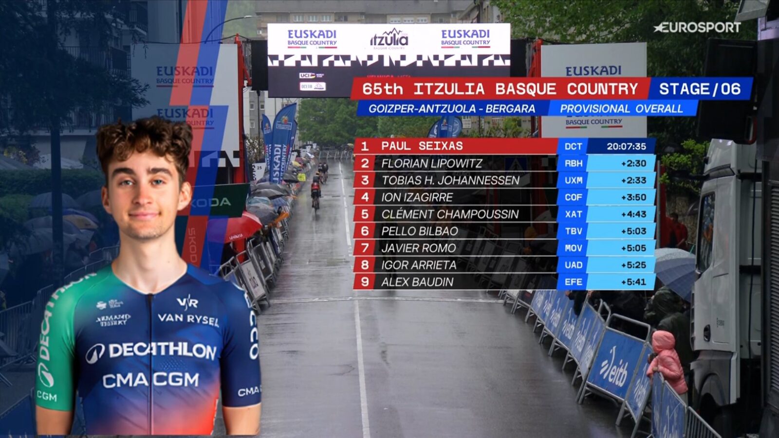 20-летний американский талант Эндрю Огаст (INEOS Grenadiers) стал главным героем последнего дня Тура Страны Басков. В проливной дождь на шестом этапе он вырвал красивую победу из небольшой лидирующей группы, одержав свою вторую профессиональную победу в карьере. Но главным итогом многодневки стала уверенная общая победа Поля Сексаса: 20-летний француз из Decathlon CMA CGM провёл безупречную неделю и впервые в карьере выиграл гонку WorldTour, сохранив жёлтую майку лидера до самого финиша в Бергаре.