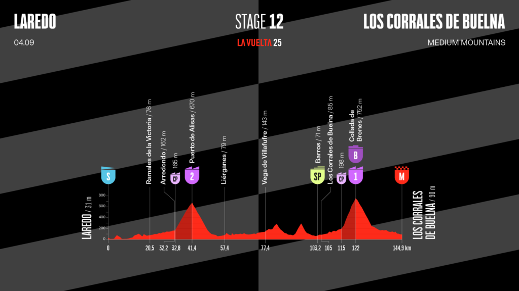 Этап протянется на 145 километров от Ларедо до Лос-Корралеса и разделится будто пополам: в начале — подъём второй категории, в конце — первой, а между ними длинная равнинная вставка с холмами.