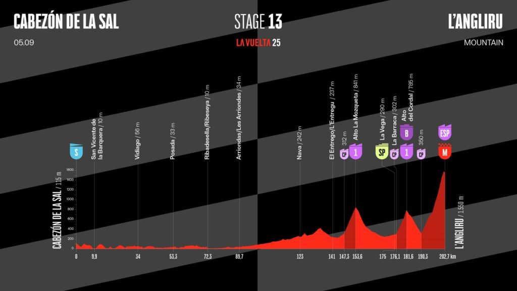 Старт в Кабесон-де-ла-Саль и длинные 150 километров равнины — словно затишье перед бурей. Затем дорога начинает подниматься: сначала Альто-де-Москета (6,6 км при 8,4%), потом крутой и извилистый Альто-де-Кордаль (5,4 км, 9,3%). Всё это горы первой категории сложности. Но все это — лишь прелюдия к финальной драме.