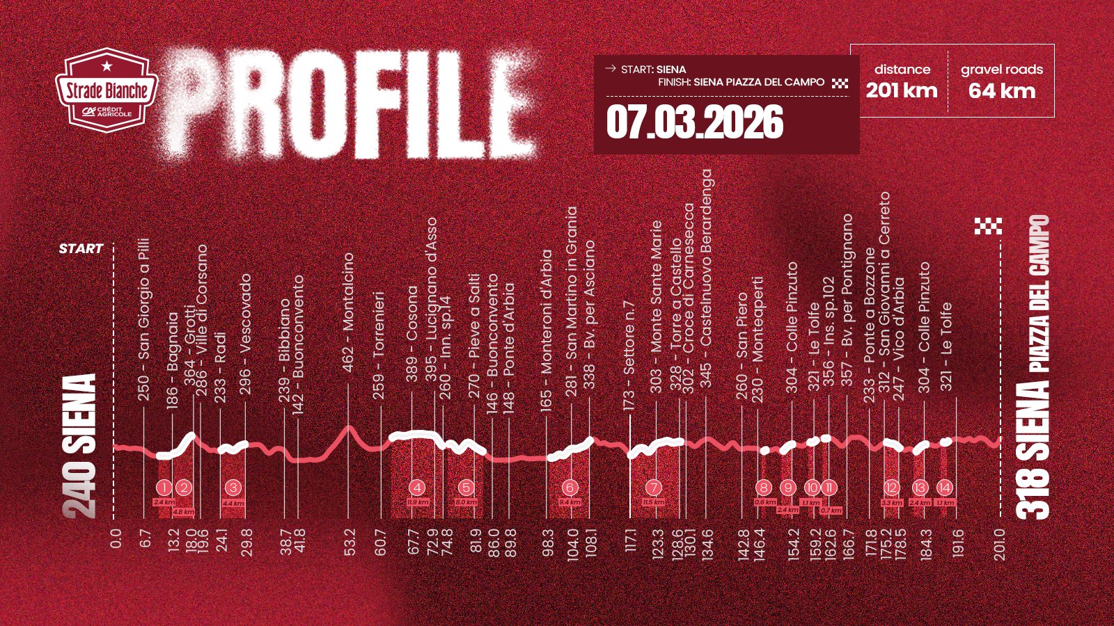 Однако финальная часть осталась нетронутой. Гонщиков ждут легендарные стеррати Сан-Мартино-ин-Грания (9,4 км) и Монте-Санте-Мари (11,5 км), а затем серия коротких, но коварных гравийных отрезков, включая два прохождения недавно названного в честь Погачара подъёма Колле-Пинцуто. Финиш по-прежнему на площади Пьяцца-дель-Кампо в Сиене после крутого подъёма по Виа Санта-Катерина.