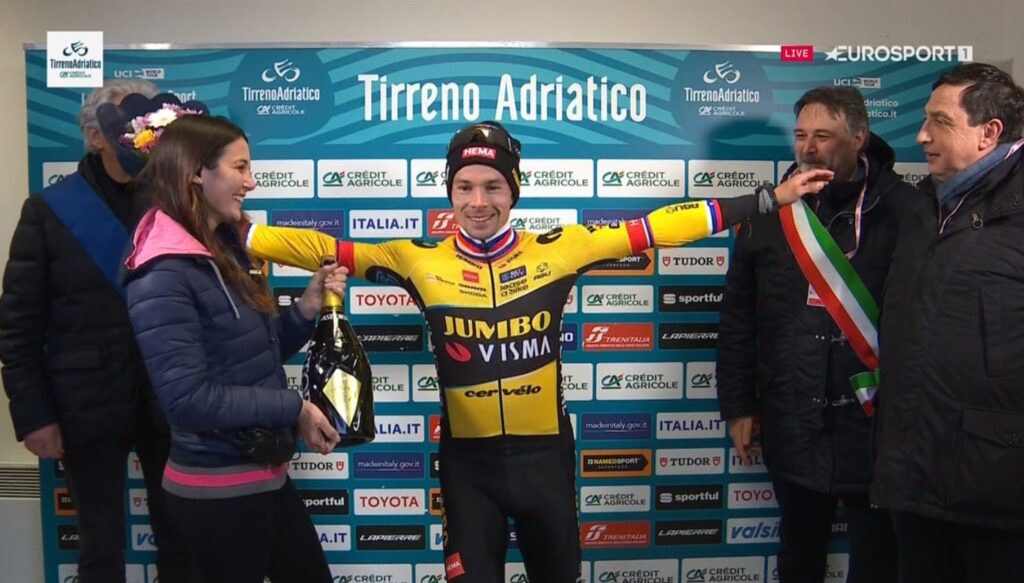 Примож Роглич выиграл пятый этап велогонки «Тиррено — Адриатико» — вторая подряд победа. Гонщик Jumbo-Visma был лучшим на сложном финальном подъёме, чуть сокращённого из-за сильного ветра и холодной погоды. Джулио Чикконе из Trek — Segafredo финишировал вторым, а Тео Гейган Харт из INEOS Grenadiers — третьим. Следом финишировали сразу представителя Bora — Hansgrohe — Джай Хиндли, Леннард Кемна и россиянин Александр Власов.