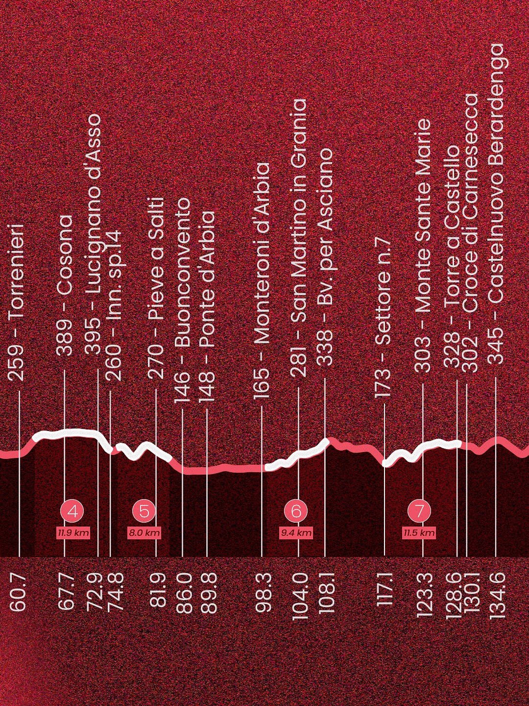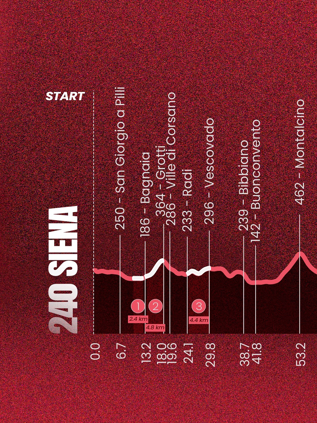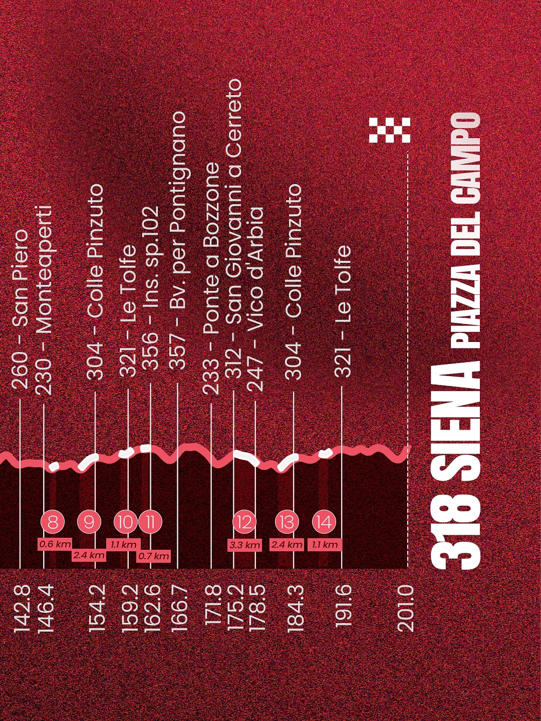 Более того, организаторы сохранили 30‑километровый финальный круг. После прохождения секторов Страда‑дель‑Кастаньо и Монтекьяро гонщикам предстоит повторный штурм Пинцуто и Ле‑Тольфе. Завершится всё классическим восхождением по узким улочкам к Пьяцца‑дель‑Кампо.