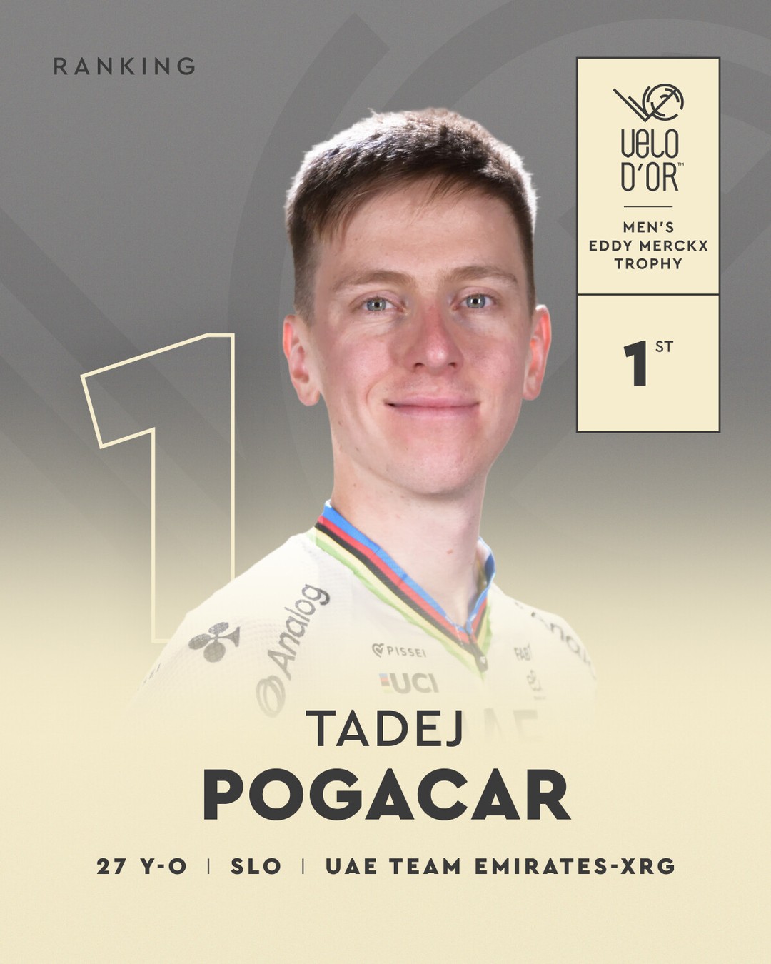 Тадей Погачар признан лучшим велогонщиком мира в 2025 году — словенец стал лауреатом премии Velo d’Or по итогам голосования ведущих спортивных журналистов планеты. После сезона, в котором он доминировал на самых престижных гонках календаря, другого варианта у жюри, по сути, и не было.