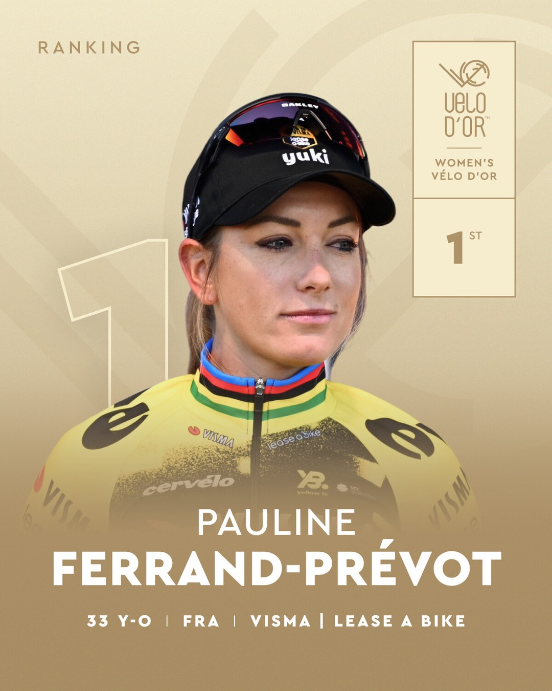 У женщин обладательницей Vélo d’Or Femmes стала Полин Ферран-Прево. Французская спортсменка также была награждена призом Trophée Jeannie Longo как сильнейшая велогонщица Франции в этом сезоне.