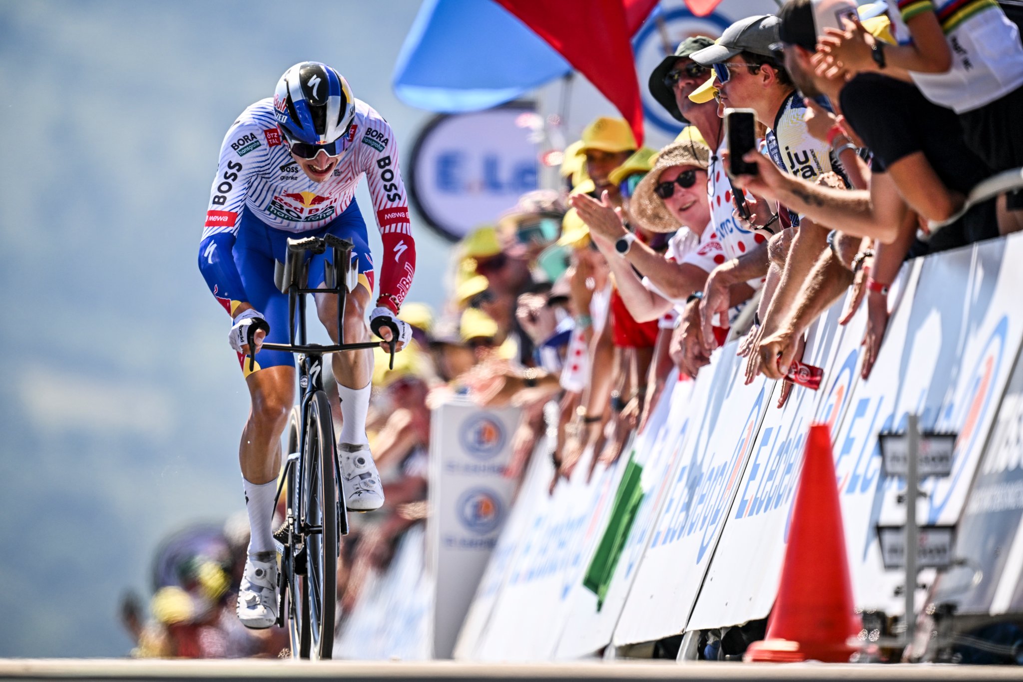 Тадей Погачар одержал победу на 13-м этапе «Тур де Франс»: 10,9-километровая горная разделка стала настоящим испытанием для большинства гонщиков. Капитан UAE Emirates — XRG проехал дистанцию ровно за 23 минуты.