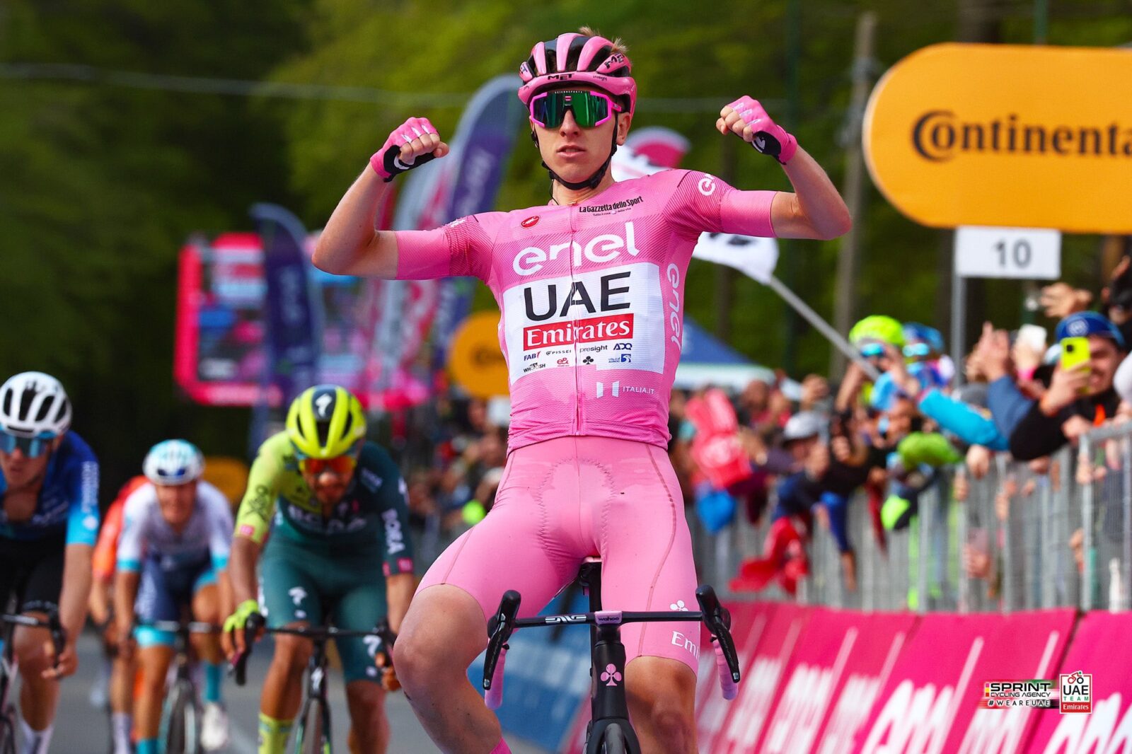 Когда до финиша оставалось уже совсем ничего, капитан UAE Emirates довольно уверенно атаковал и оторвался от соперников, после чего поднял руку и отпраздновал победу. Третью на этой «Джиро».