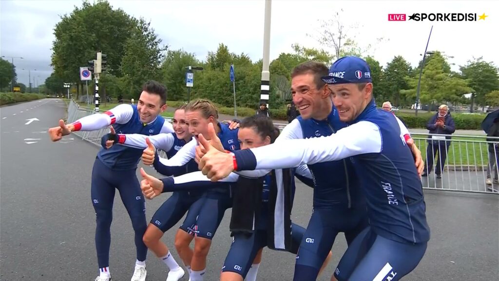Сборная Франции выиграла смешанную разделку на 38,4 километра. Брюно Армирай, Реми Каванья, Бенжамин Тома, Жюльет Лабус, Седрин Кербаол и Одри Кордон-Раго проехали дистанцию за 44 минуты и 23 секунды.