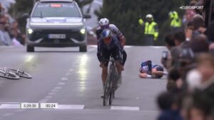 В спринте за второе место Пидкок опередил всех, но финал омрачило жёсткое падение Максима Ван Гилса из Red Bull — Bora — Hansgrohe. Бельгиец столкнулся с Кристеном, который изменил траекторию и прижал его к барьеру. Жюри гонки было сурово — не просто релегация, а дисквалификация. Впрочем, третье место всё равно досталось команде UAE Emirates — XRG — Бенуа Коснефруа финишировал четвёртым, а потому занял место Кристена на подиуме.